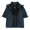 Blusa Gothic Lolita Verde Escuro com Gola de Folhos e Broche de Cruz Estilo Vitoriano