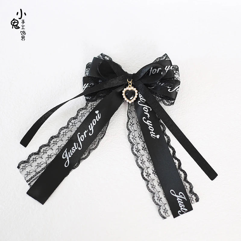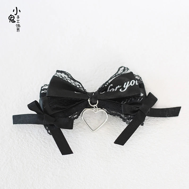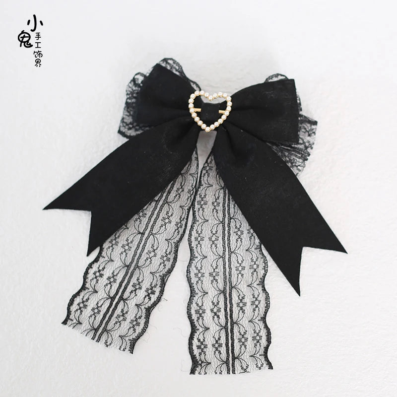 Broche Gótico Lolita Jirai Kei Yami Kawaii com Laço de Fita de Renda Preta e Coração de Pérola