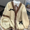 Conjunto: Cardigan de Malha Bege e Camisa Branca com Riscas Castanhas Estilo Mori Kei Japonês