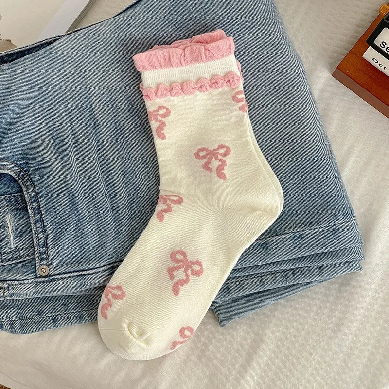 Este conjunto de 4 meias com padrão de laço rosa é inspirado na moda japonesa Harajuku. Feitas de uma mistura de poliéster e spandex, estas meias oferecem durabilidade e um ajuste confortável. O design de tubo médio e a espessura padrão tornam-nas adequadas para uso casual em várias estações.