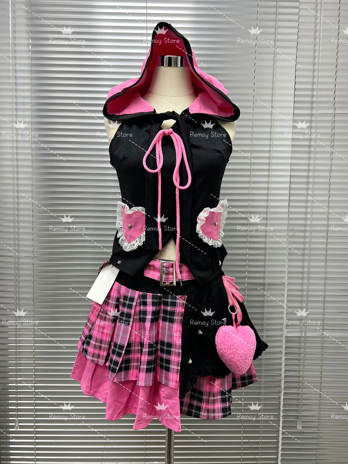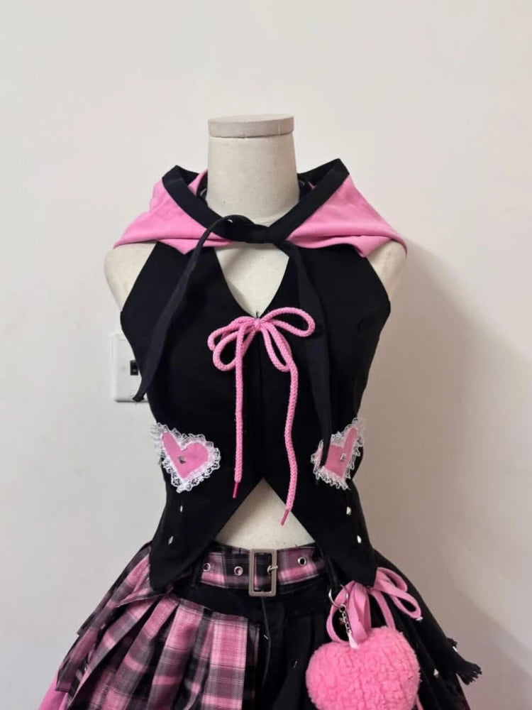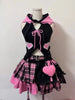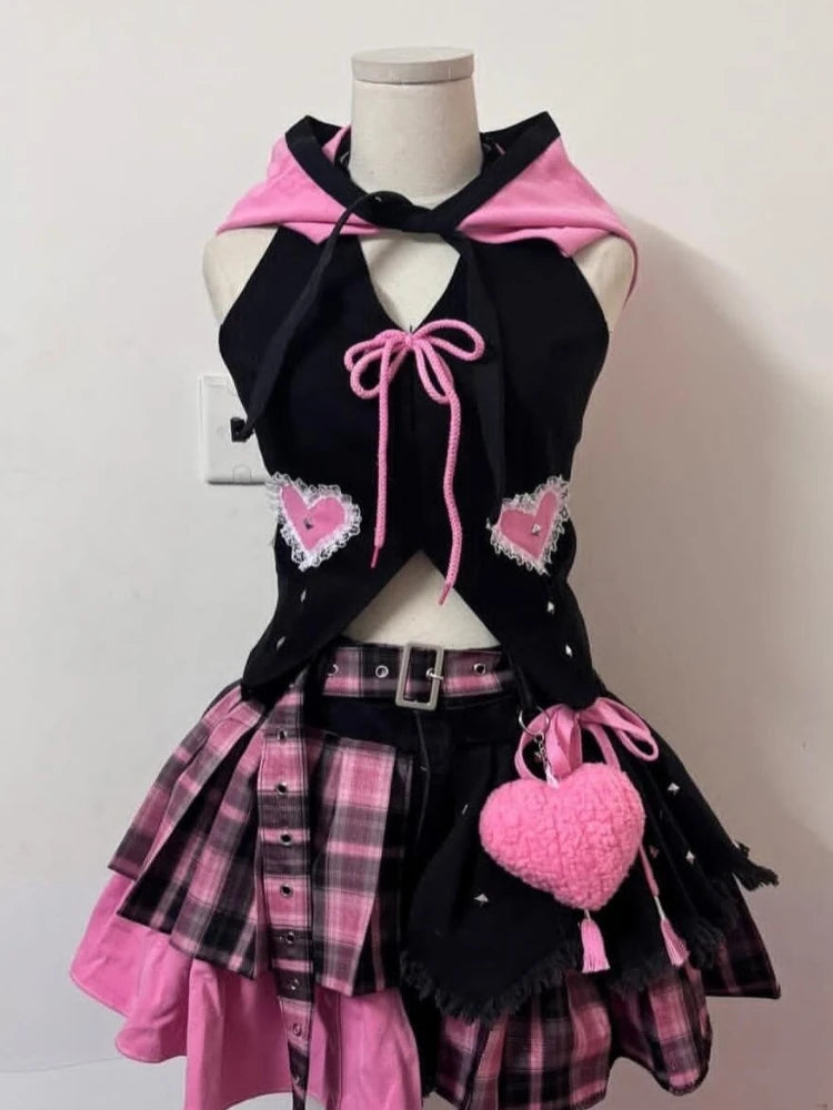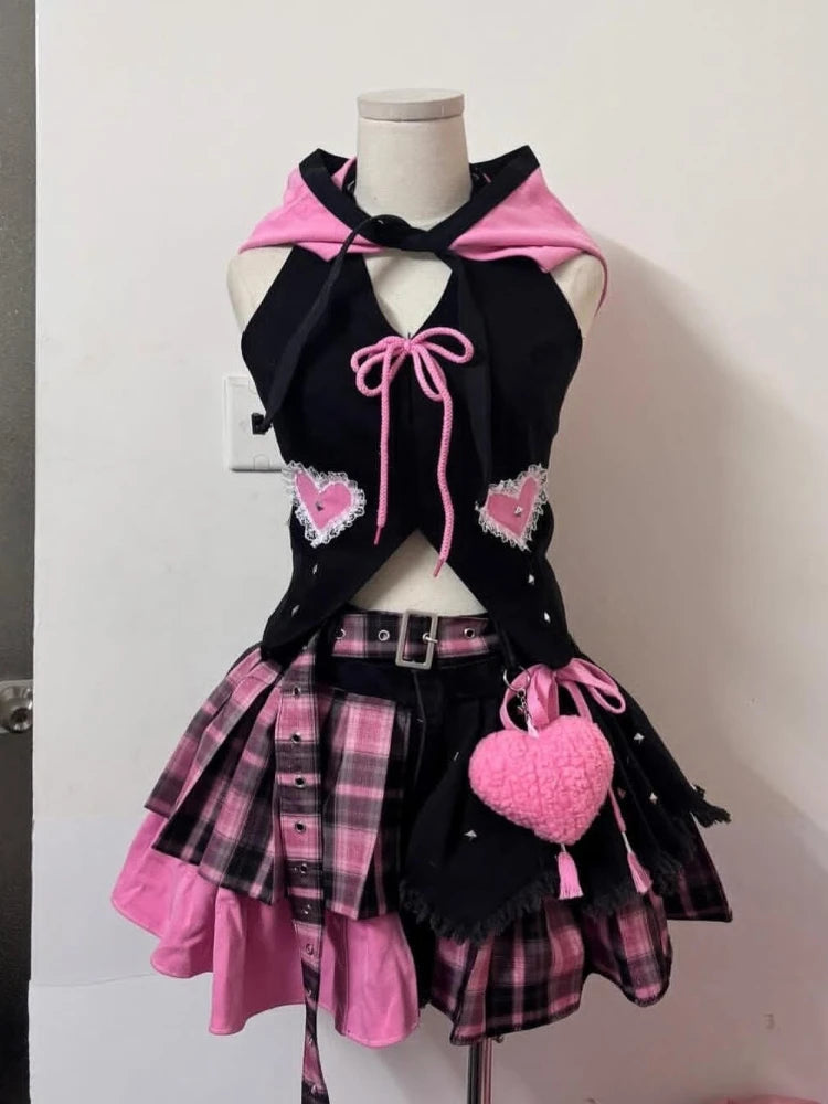 Este conjunto de roupa Jirai Kei apresenta um design xadrez em rosa e preto, combinando um top cropped gótico Lolita com uma mini saia. O conjunto é feito de uma mistura de algodão e poliéster, oferecendo um visual doce e elegante, perfeito para a primavera e o verão.