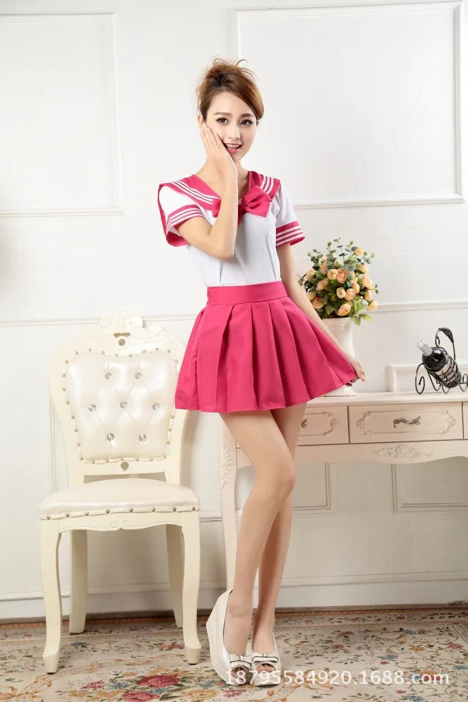 Este conjunto de uniforme de marinheiro japonês cor-de-rosa inclui uma blusa e uma saia de estudante, perfeito para cosplay kawaii. O conjunto apresenta um design com folhos e é feito de uma mistura de algodão e poliéster, adequado para a primavera.