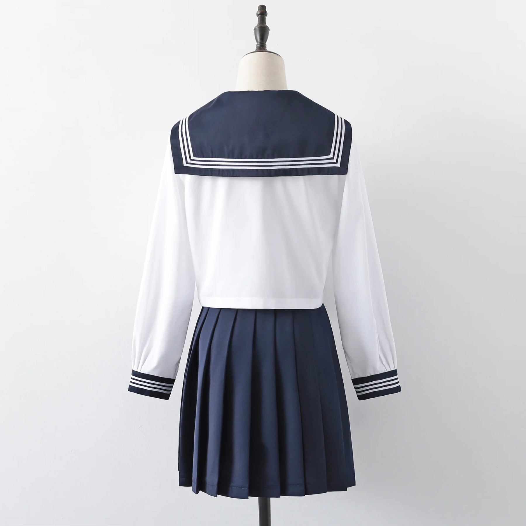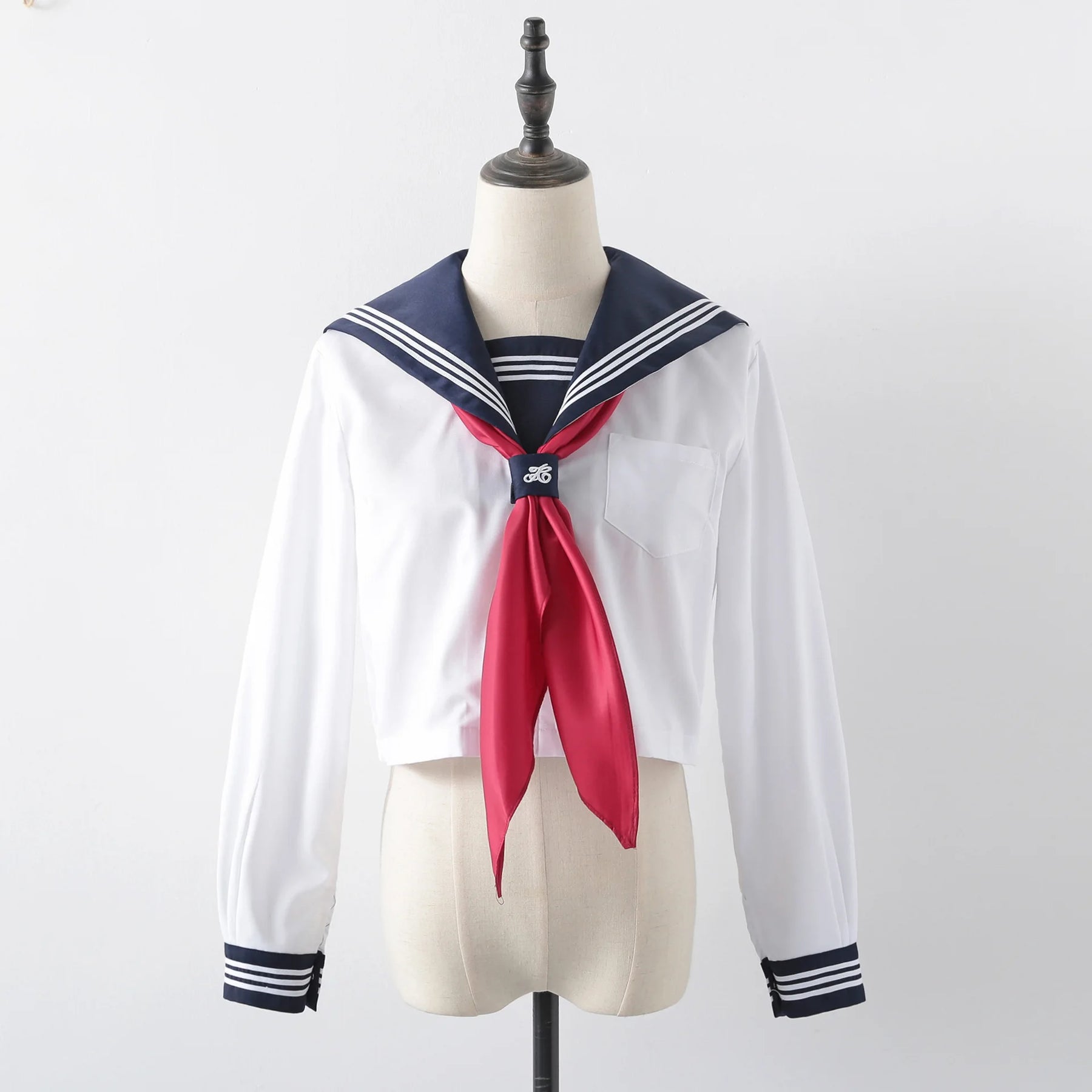 Este conjunto de uniforme escolar japonês azul-marinho apresenta uma blusa de manga comprida e uma saia plissada, complementados por um lenço vermelho. Feito de uma mistura de poliéster, é desenhado no estilo clássico de uniforme de marinheiro.