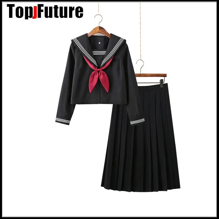 Este conjunto de uniforme escolar japonês preto apresenta uma blusa de marinheiro de manga comprida combinada com uma saia plissada e uma gravata borboleta vermelha. O tecido é de serge de alta qualidade, oferecendo uma textura semelhante ao linho com bom caimento e resistência a rugas. A saia inclui modelagem e pregas de alta temperatura japonesa, com um botão de cintura ajustável para um ajuste perfeito. Adequado para todas as estações.