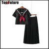 Conjunto de Uniforme Escolar Japonês Preto - Top de Marinheiro de Manga Curta com Saia Plissada Maxi e Laço Vermelho