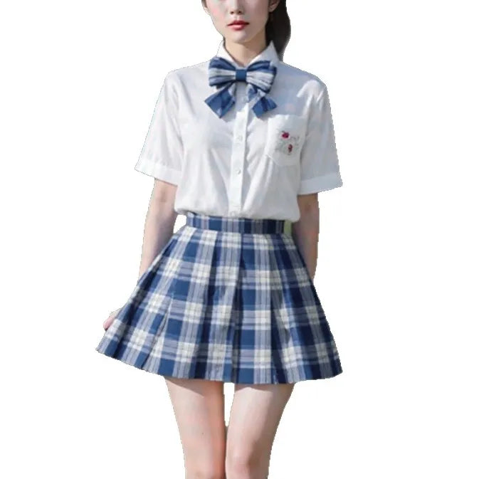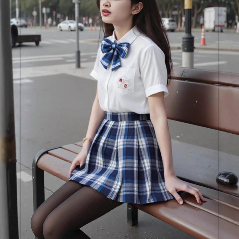 Este Conjunto de Uniforme Escolar Japonês Xadrez Azul inclui uma camisa branca, uma saia plissada de tartan azul e uma gravata borboleta a condizer. Perfeito para uniformes escolares, combina estilo tradicional com conforto.