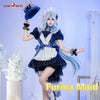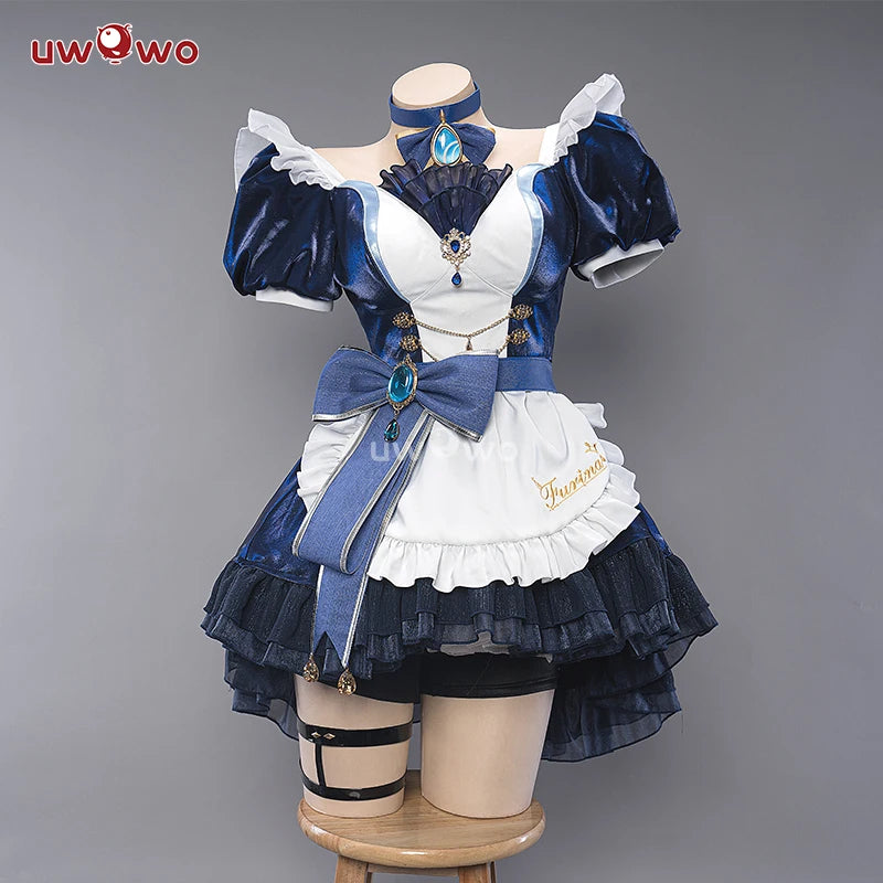 Abrace o charme de Genshin Impact com este Traje de Cosplay Furina Azul Vitoriano. Este vestido inspirado em Lolita vem completo com um avental e chapéu, perfeito para capturar a estética kawaii.