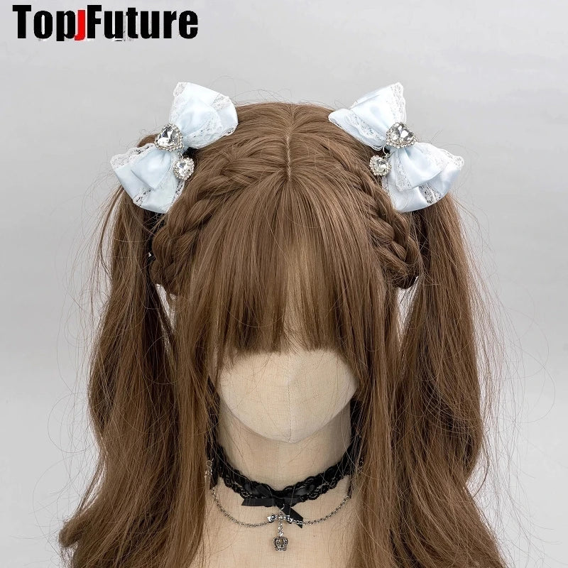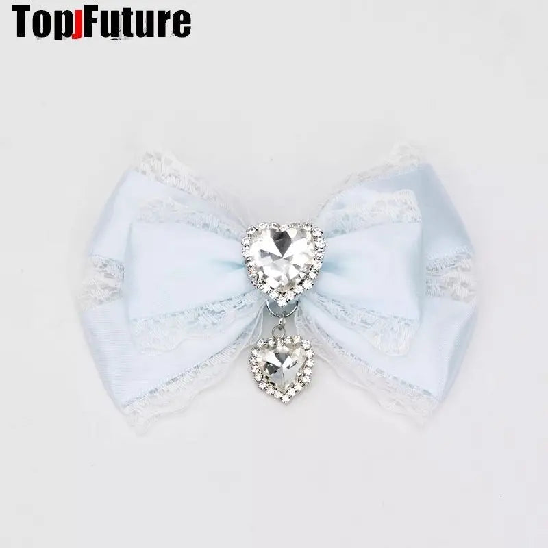 Ganchinho de Cabelo Azul Claro com Laço de Renda e Coração de Cristal Estilo Sweet Lolita Tenshi Kawaii