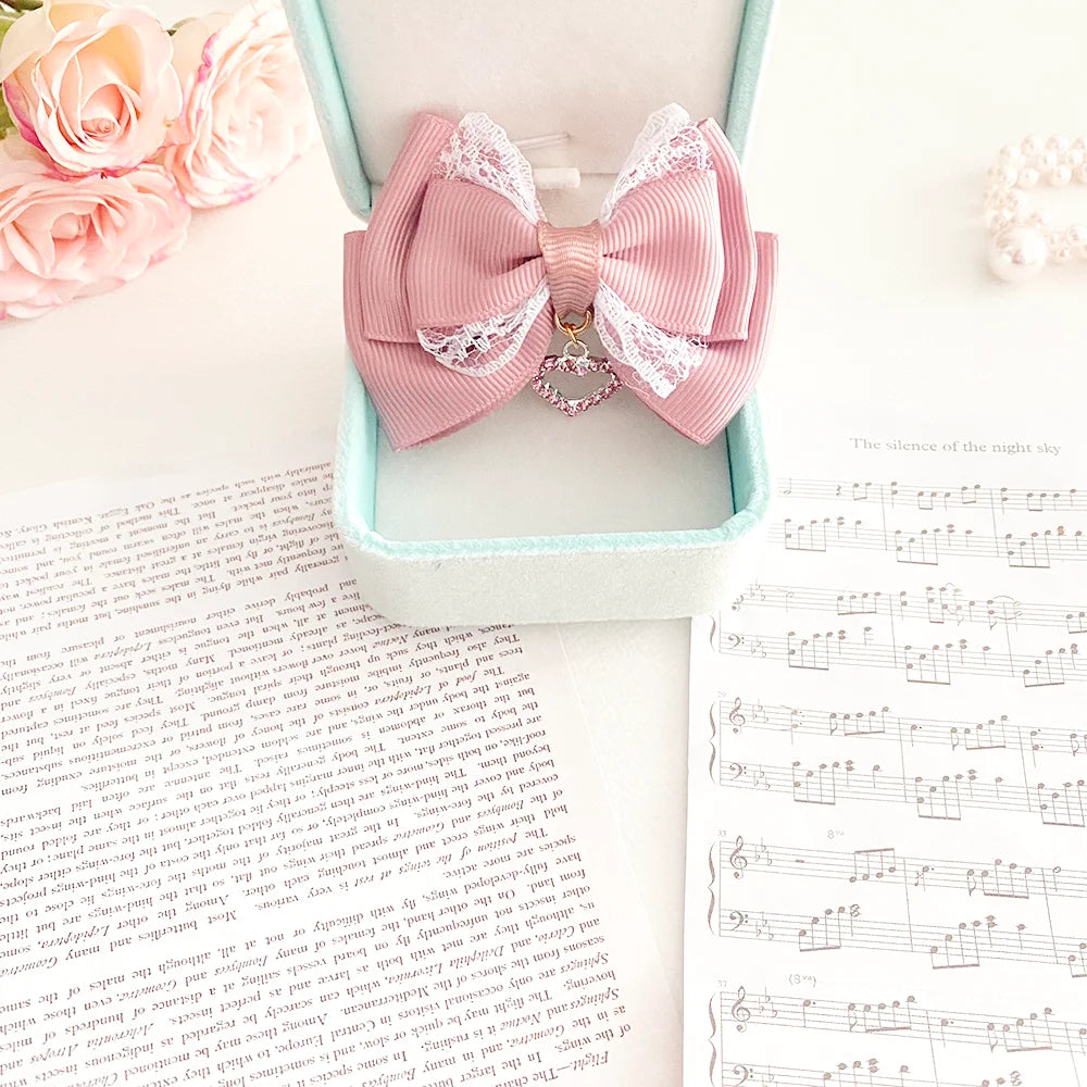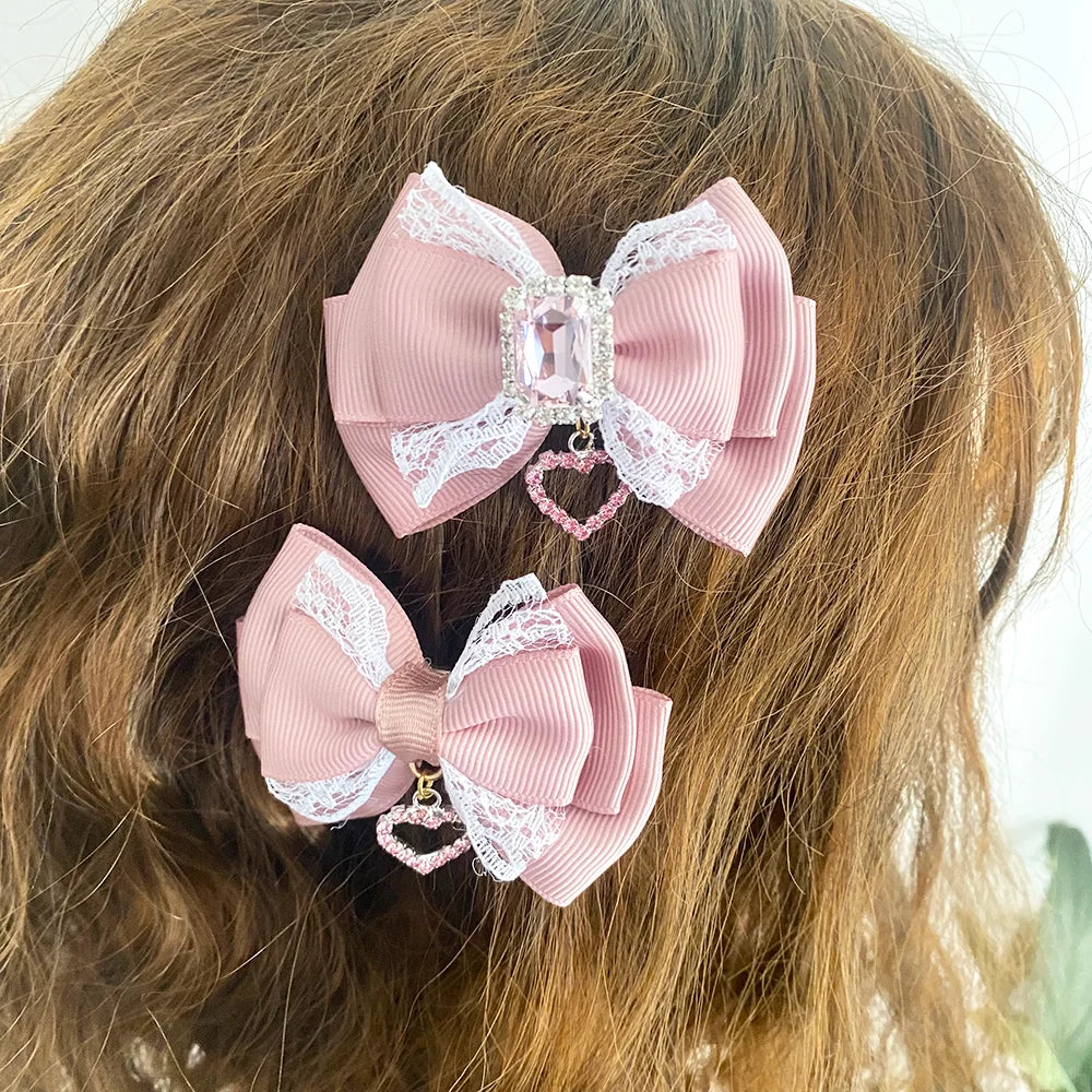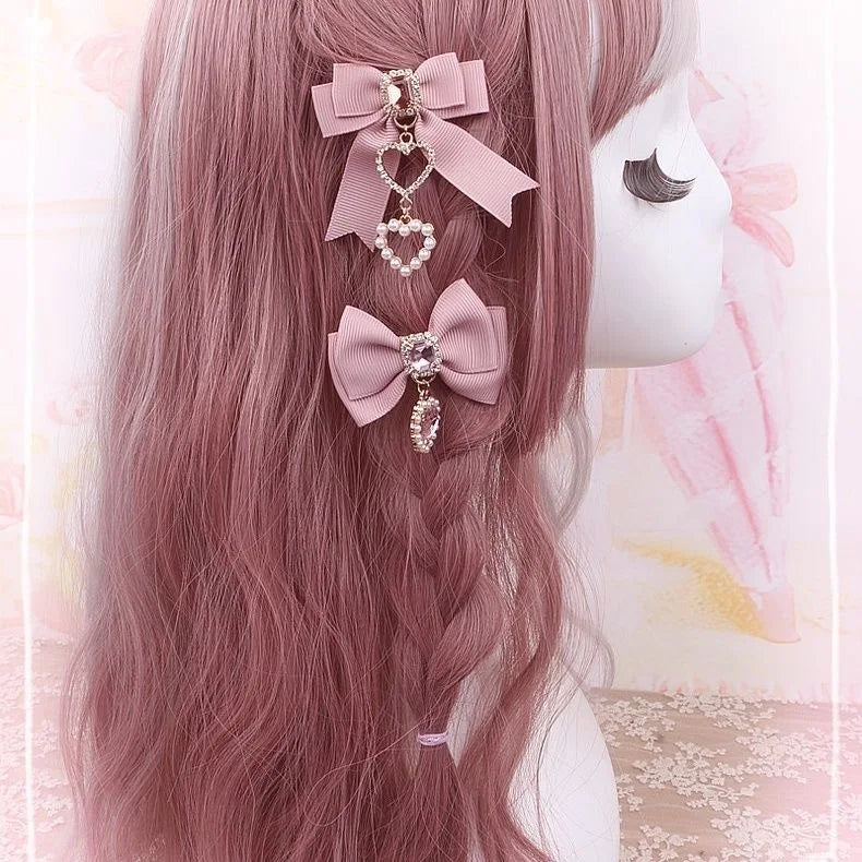 Ganchinho de Cabelo com Laço de Renda Rosa e Branco e Coração de Cristal Sweet Lolita Jirai Kei Tenshi Kawaii