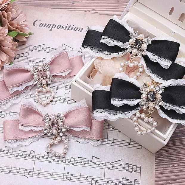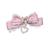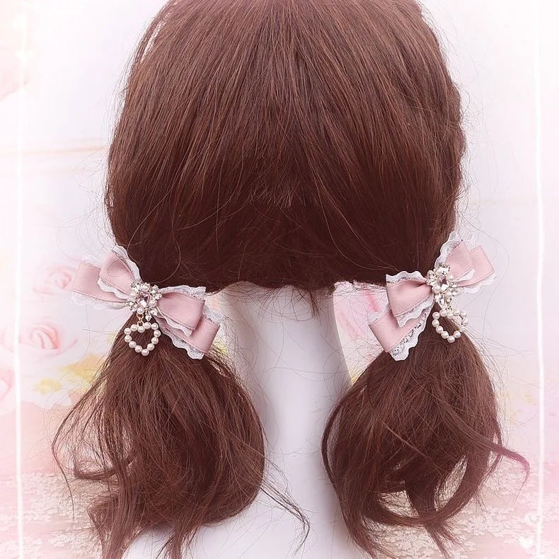 Ganchinho de Cabelo com Laço de Renda Rosa e Coração de Pérola Sweet Lolita Jirai Kei Tenshi Kawaii Acessório