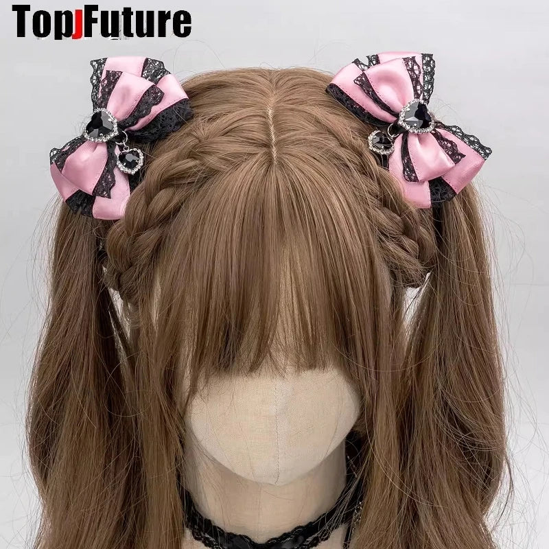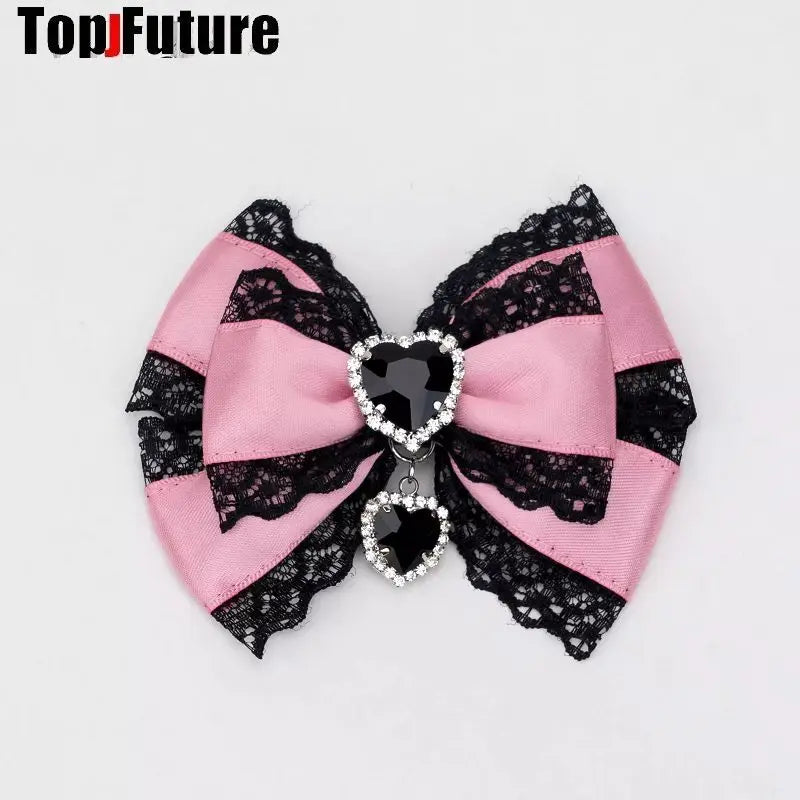 Ganchinho de Cabelo com Laço de Renda Rosa e Preto e Coração de Cristal Estilo Ryousangata Yami Kawaii