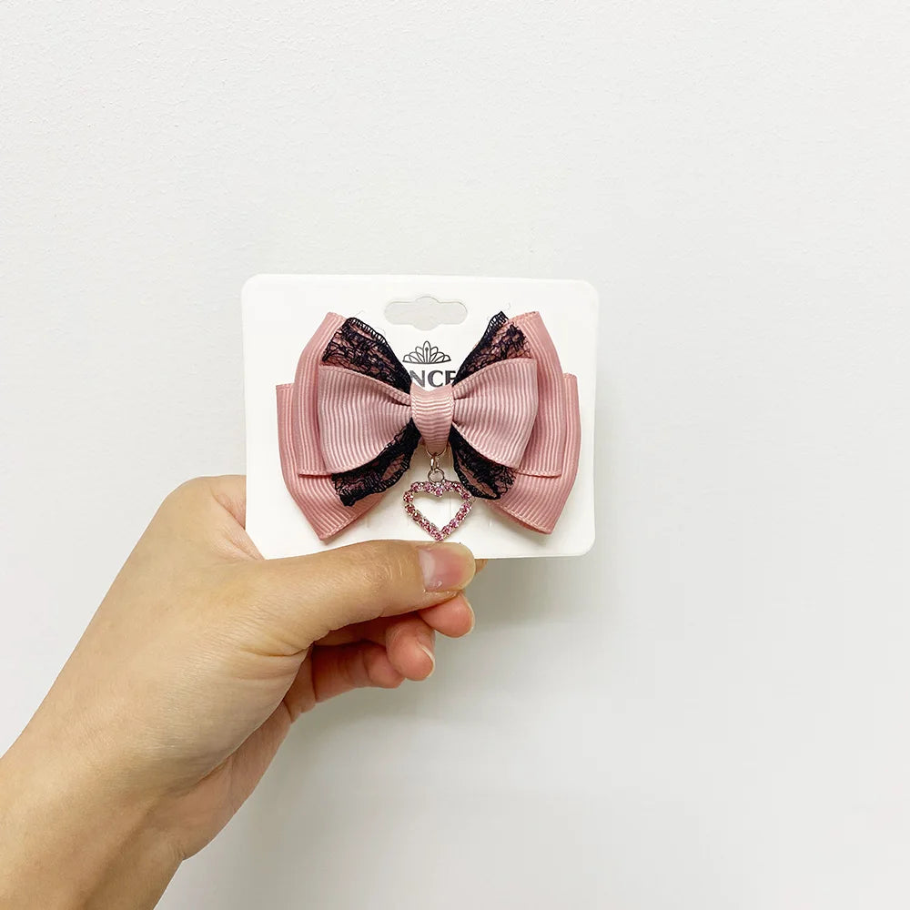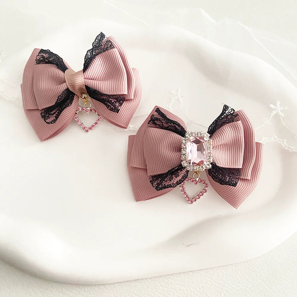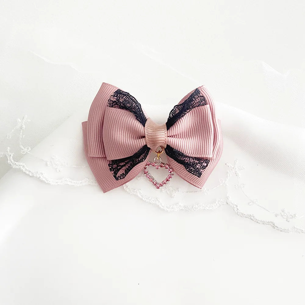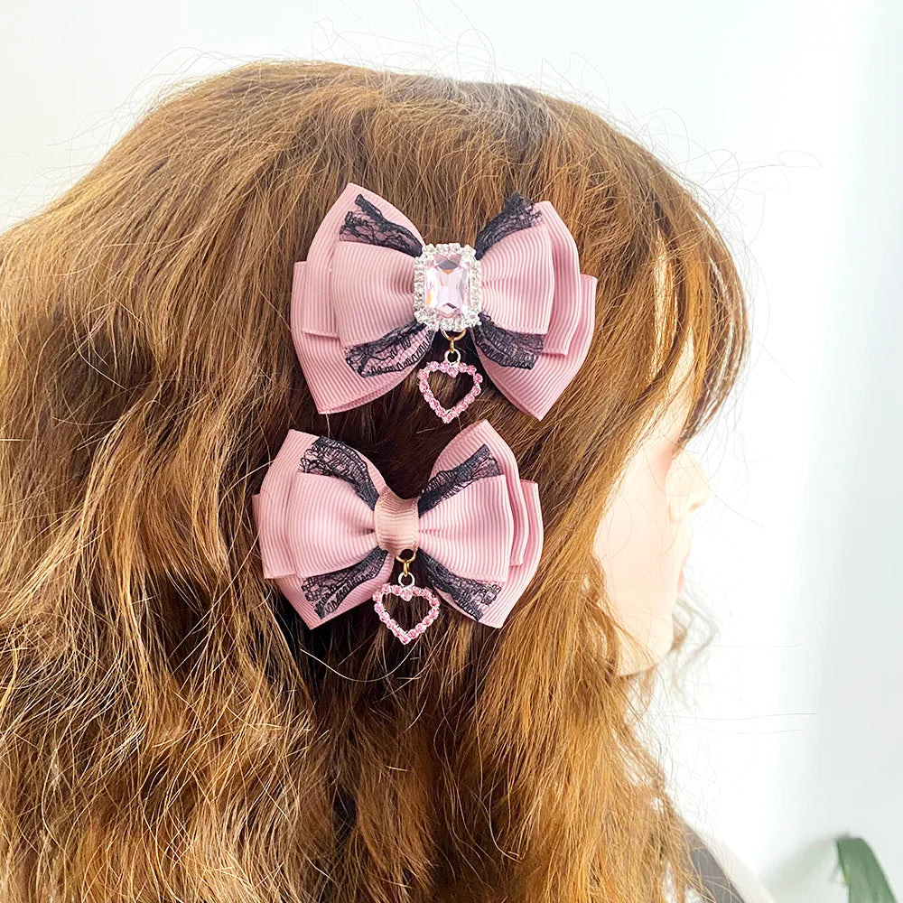 Ganchinho de Cabelo com Laço Rosa, Renda Preta e Pingente de Coração Tenshi Kawaii Fairycore Acessório
