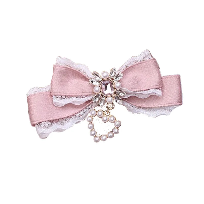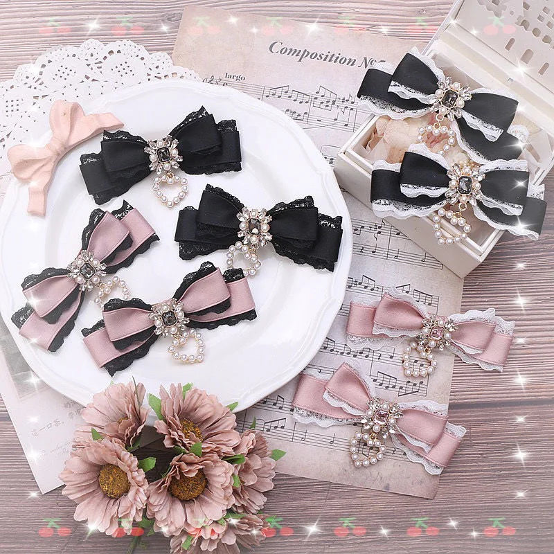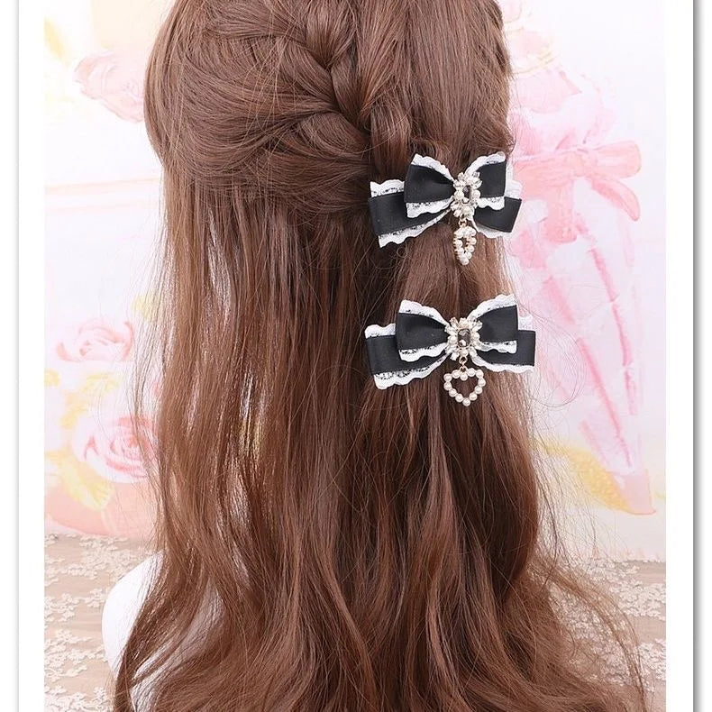 Gótico Ryousangata Jirai Kei Estilo Gancho de Cabelo com Laço de Renda Preto e Branco e Pendente de Coração
