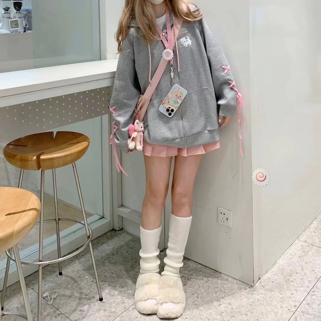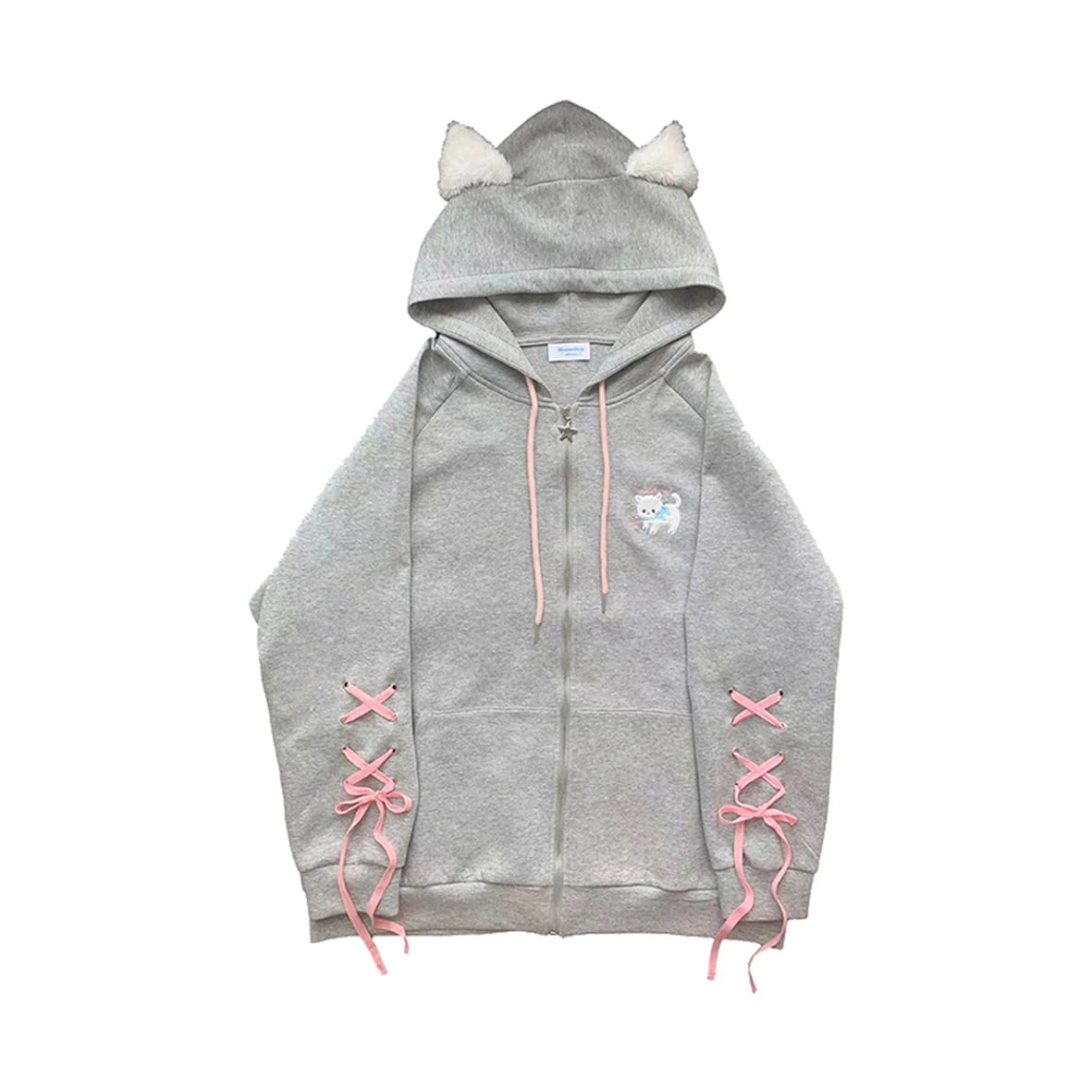 Este hoodie cinzento apresenta adoráveis orelhas de gato e um design de laço com fita rosa, incorporando o estilo fofo e divertido de Harajuku. Perfeito para adicionar um toque de kawaii ao seu guarda-roupa.