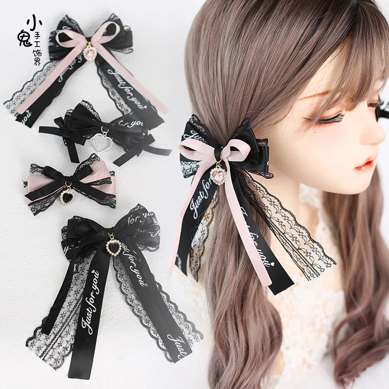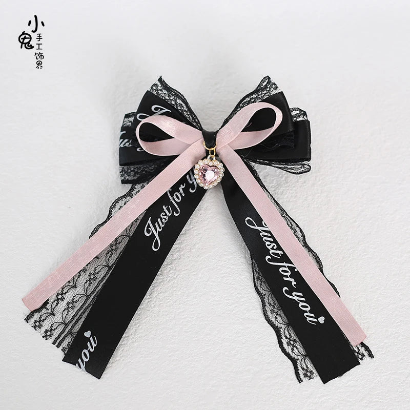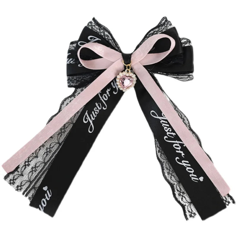 Laço Longo Preto e Rosa com Pingente de Coração Estilo Kawaii Harajuku Jirai Kei Tenshi
