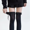 Estas meias pretas com folhos acima do joelho apresentam elegantes laços de cetim, perfeitas para adicionar um toque de moda japonesa Jirai Kei ao seu conjunto. Feitas de nylon, estas meias oferecem um padrão sólido e espessura padrão, tornando-as uma adição versátil ao seu guarda-roupa.