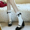 Estas meias brancas pelo tornozelo apresentam um laço de renda preto adorável, perfeito para adicionar um toque de estilo kawaii Lolita ao seu visual. Feitas de uma mistura de poliéster e algodão, oferecem um visual doce e fofo com um padrão de cor sólida.