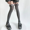 Elegantes meias cinza acima do joelho com laços de cetim, inspiradas na moda japonesa Jirai Kei. Estas meias são feitas de nylon com um padrão sólido e espessura padrão, perfeitas para adicionar um toque de elegância a qualquer conjunto.