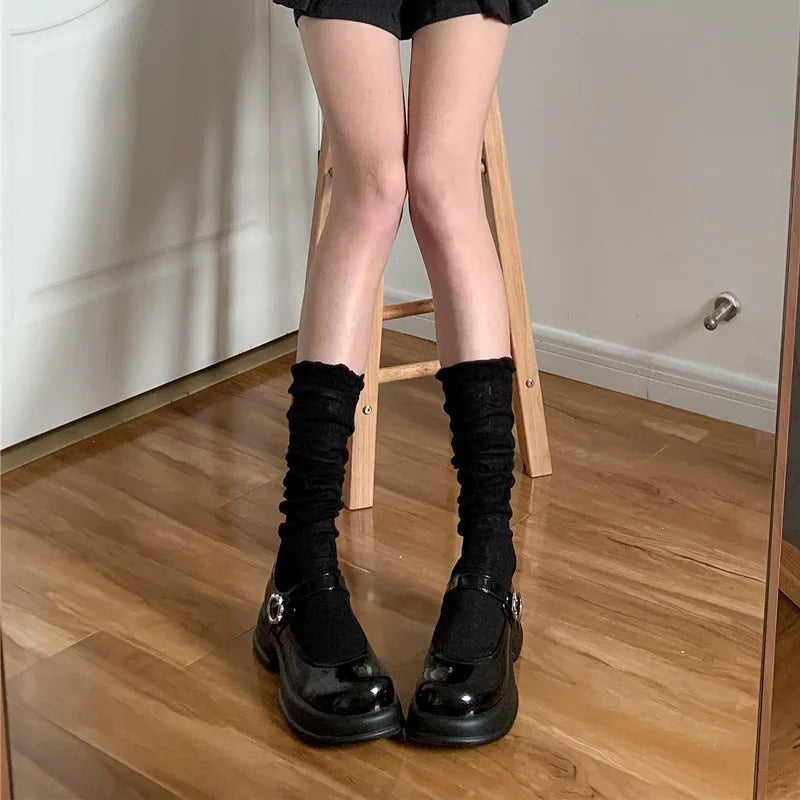 Meias Pretas Scrunch com Folho Suave Estilo Gothic Lolita Jirai Kei