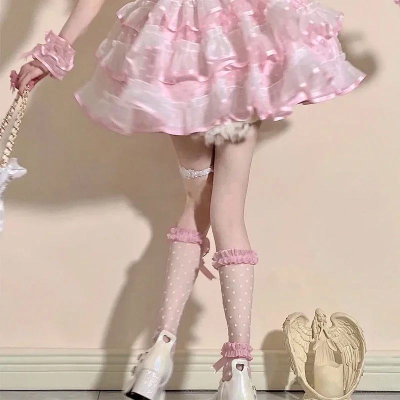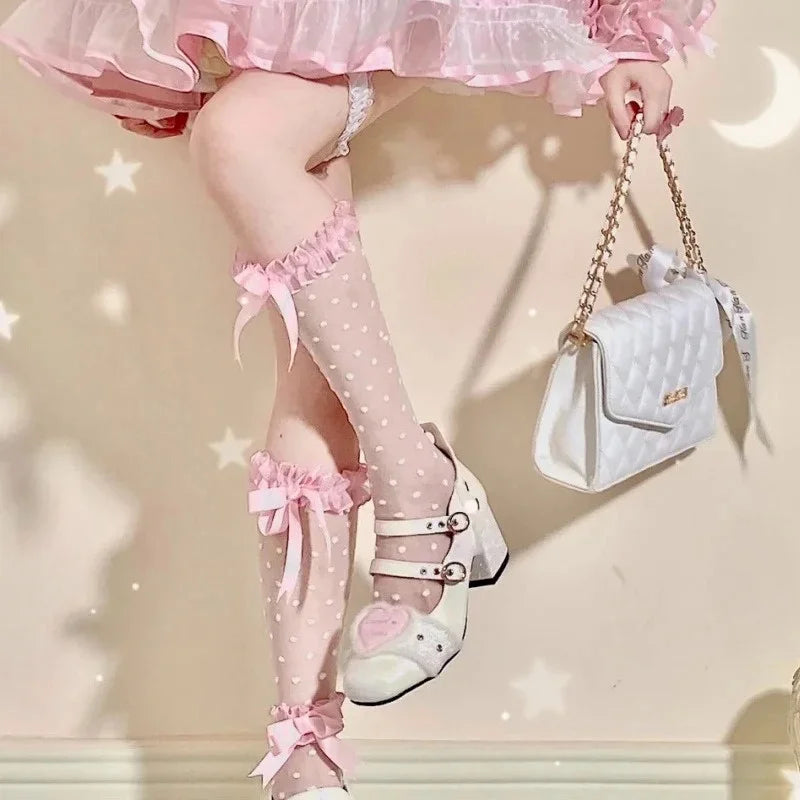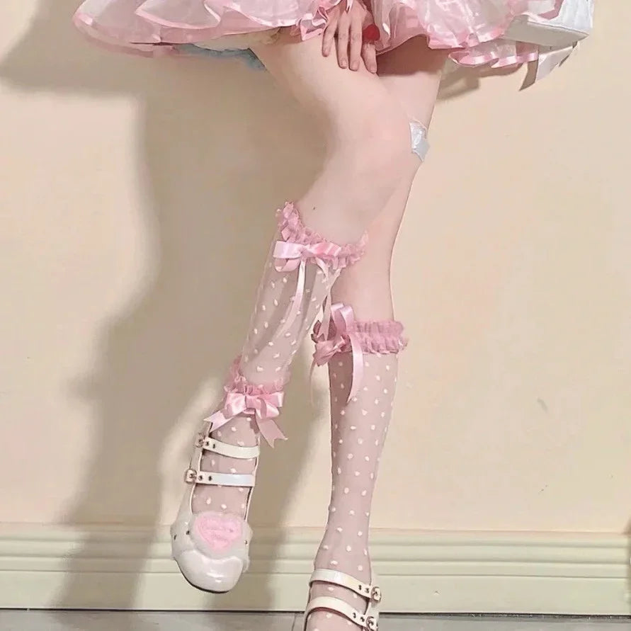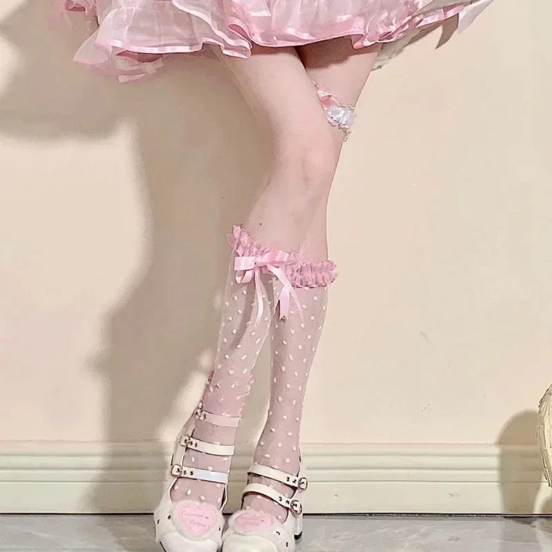 Meias Transparentes com Bolinhas Cor-de-Rosa Estilo Kawaii Ryousangata Jirai Kei