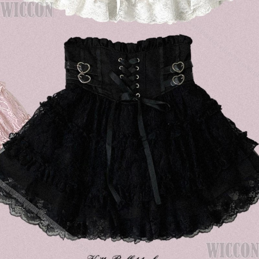 Saia Gótica Yami Kawaii Preta com Renda, Apliques em Forma de Coração e Cintura de Espartilho