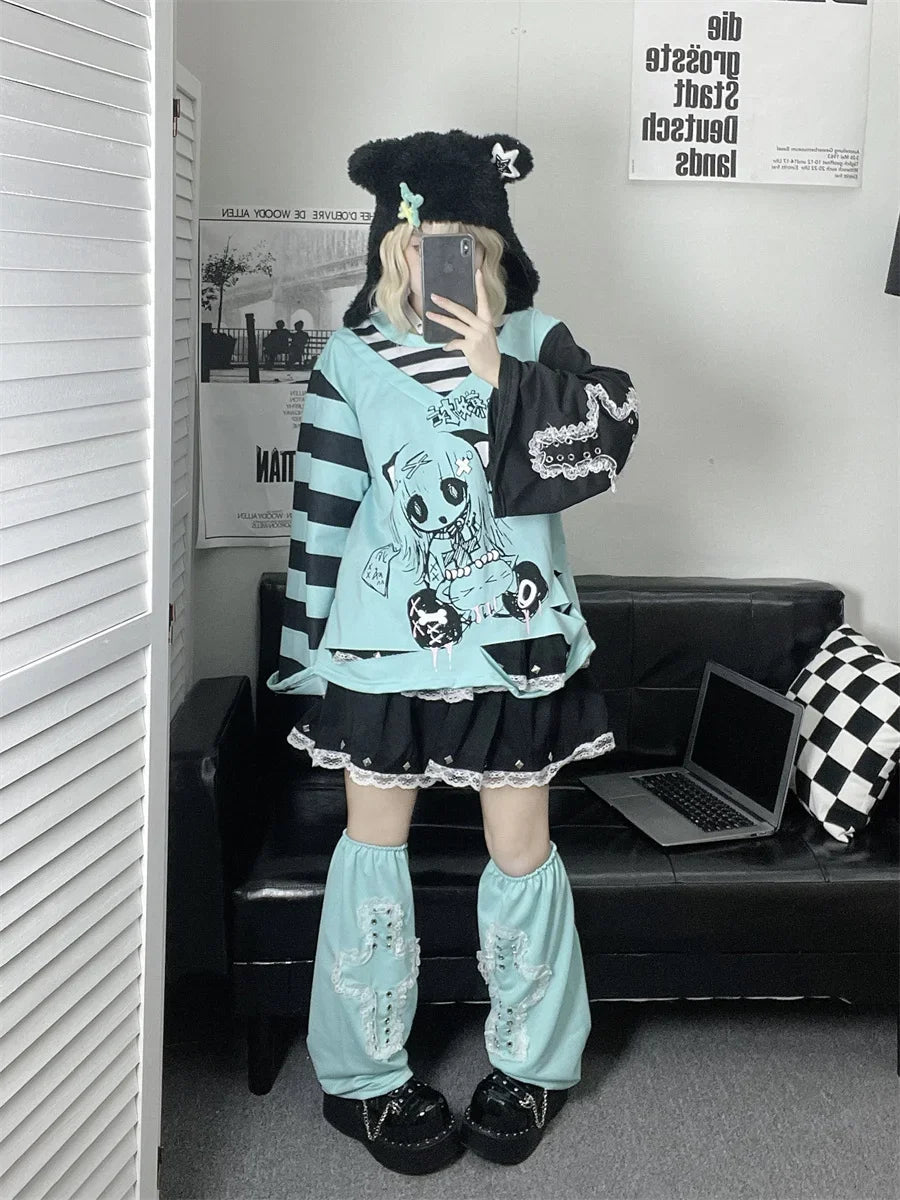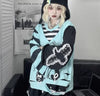 Abrace o charme lúdico da moda Harajuku com este top oversized azul aqua, apresentando um estilo kawaii e design de patchwork de desenhos animados. Perfeito para todas as estações, este top oferece um ajuste solto e ligeira elasticidade para um uso confortável.