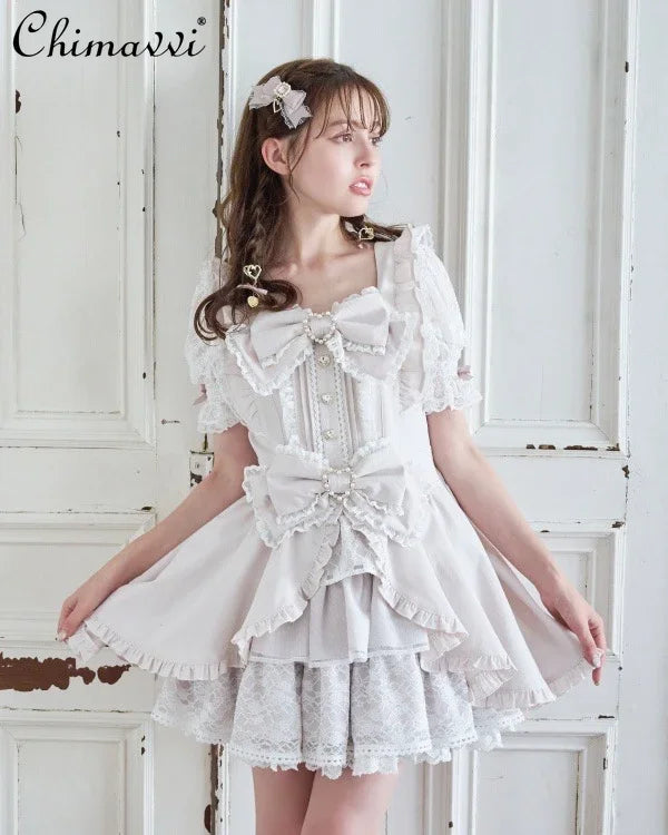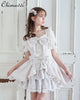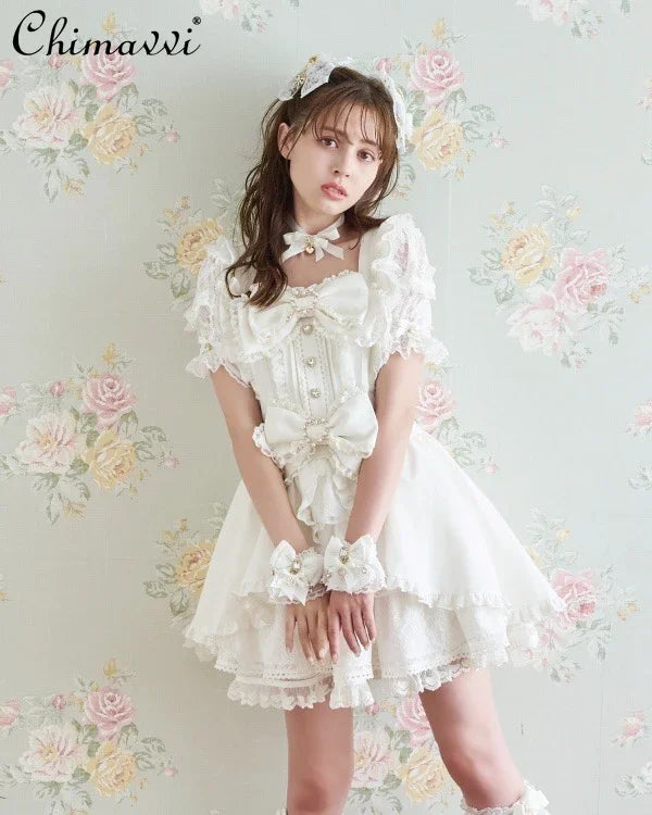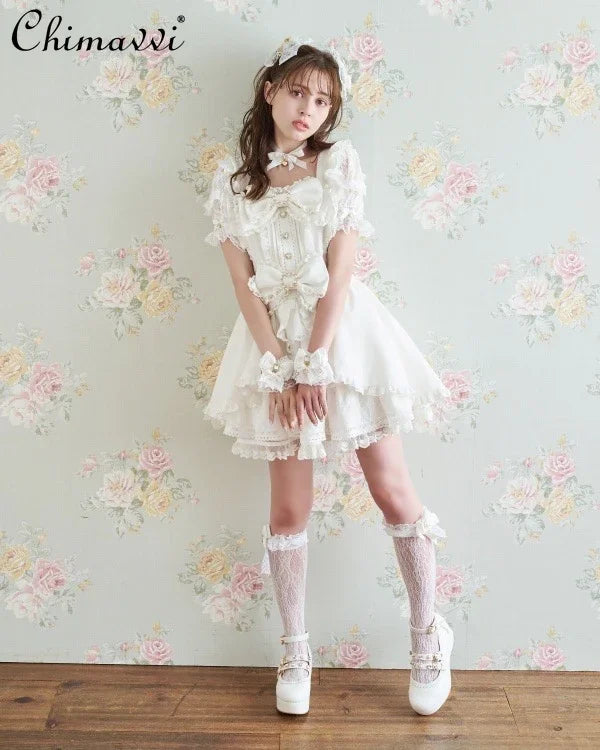 Este vestido branco doce Lolita apresenta folhos encantadores e uma cintura alta, perfeito para um visual de princesa kawaii. O vestido é desenhado em cor sólida com um ajuste justo e mangas em balão, oferecendo um estilo clássico Lolita.
