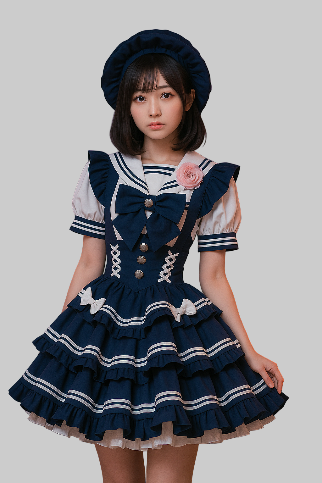 Este Vestido Lolita Marinheiro Azul Marinho apresenta uma gola clássica de marinheiro e uma doce silhueta em linha A. O vestido é adornado com apliques, pregas, laços, detalhes cruzados e patchwork, tornando-o uma adição encantadora a qualquer guarda-roupa. É confeccionado a partir de um tecido misto de algodão e poliéster, adequado para uso na primavera e no verão.